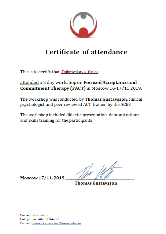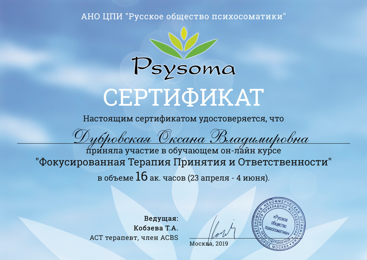 Вы также свободны выйти из психологической помощи в любое время без обсуждения причины, однако я считаю, что обсуждения будет полезно для Вас и для меня. Это может быть сделано в телефонном разговоре, в переписке мессенджеров (Whatsapp, telegram) или в электронном письме.